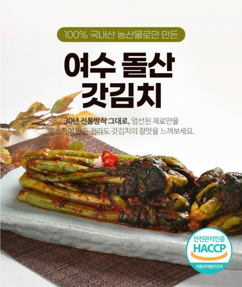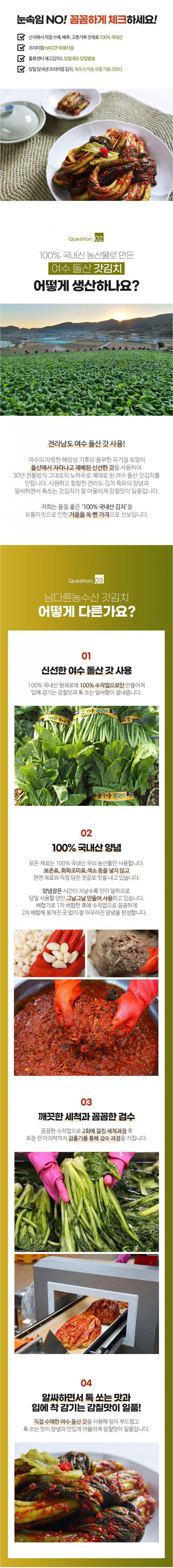 ▶원재료 : 절임갓(79%국산),고춧가루(3.36%국산),무(3.15%국산),젓갈류(4%국산),양파(1%국산)